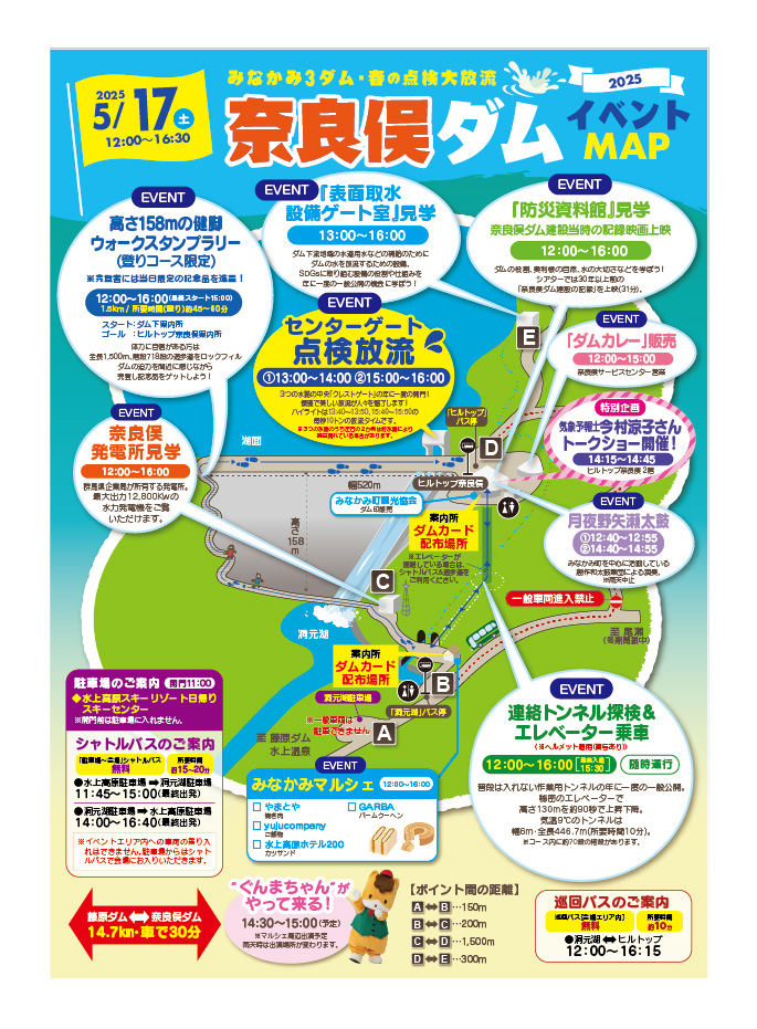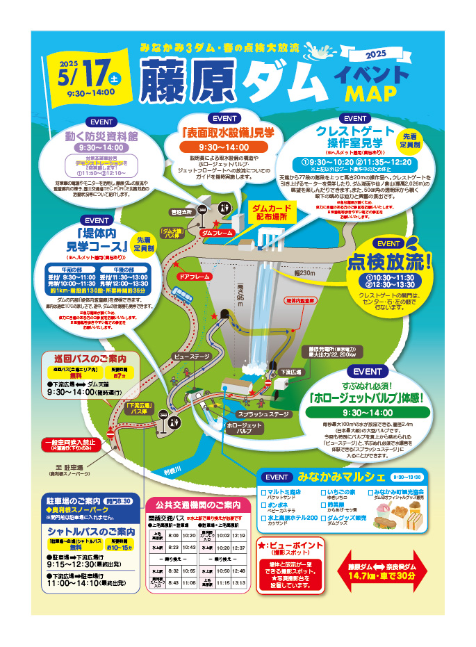 また、普段は立ち入ることのできない堤体内見学や施設見学、地元グルメが集まるマルシェなど、関連イベントも予定しています。