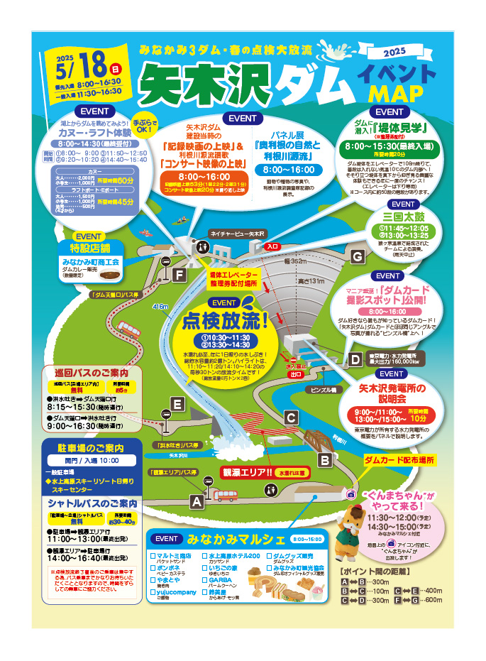 群馬県みなかみ町・奥利根地域に位置する矢木沢ダム・奈良俣ダム・藤原ダム の3つのダムでは、毎年、洪水期を迎える前に放流設備が安全に作動するかを確認する「春の点検放流」が行われます。 この3ダムがそろって放流を行う貴重な機会を、多くの方に楽しんでいただこうと2018年から始まった本イベントは、2026年で 第8回目 を迎えます。 みなかみ町は、利根川の最上流域に位置し、関東地方約3,000万人の暮らしを支える“水の源流の町”。その中核を担う3つのダムは「関東の水がめ」とも呼ばれ、年に一度の点検放流は、今やみなかみの春の風物詩となっています。 毎秒最大100トンもの水を豪快に放つ日本最大級のホロージェットバルブを持つ藤原ダム、“ダムの女王”と称される壮大なロックフィルダム奈良俣ダム、総貯水容量約2億トンを誇り、水しぶきを間近で体感できる矢木沢ダム。 それぞれ個性の異なる、大迫力の放流シーンをお楽しみいただけます。 また、普段は立ち入ることのできない堤体内見学や施設見学、地元グルメが集まるマルシェなど、関連イベントも予定しています。