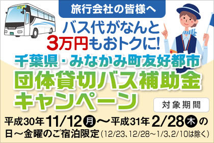 内容は、千葉県(全域)および友好都市(取手市、伊奈町、さいたま市、中野区、三宅村)に在住の方による 15名様以上団体貸切バスが対象で、1台につき3万円を旅行会社様に補助いたします。