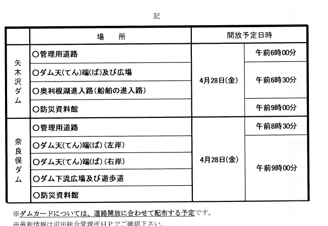 矢木沢ダムと奈良俣ダムの管理用道路をはじめとする一般利用施設につきましては、下記の通り解放を予定しております。