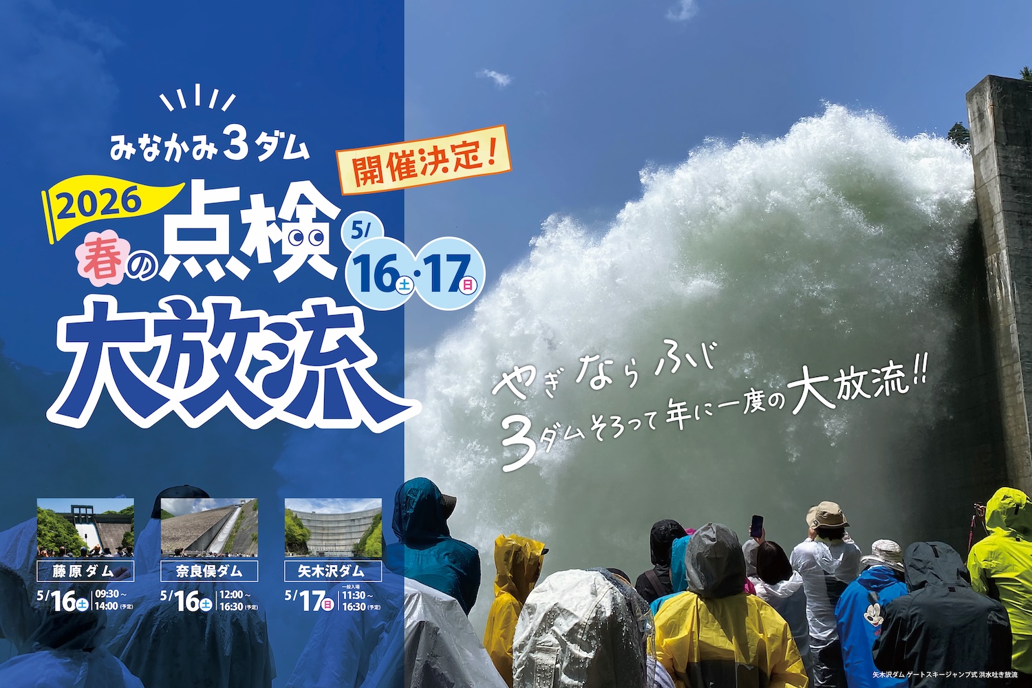 群馬県みなかみ町・奥利根地域に位置する矢木沢ダム・奈良俣ダム・藤原ダム の3つのダムでは、毎年、洪水期を迎える前に放流設備が安全に作動するかを確認する「春の点検放流」が行われます。 この3ダムがそろって放流を行う貴重な機会を、多くの方に楽しんでいただこうと2018年から始まった本イベントは、2026年で 第8回目 を迎えます。 みなかみ町は、利根川の最上流域に位置し、関東地方約3,000万人の暮らしを支える“水の源流の町”。その中核を担う3つのダムは「関東の水がめ」とも呼ばれ、年に一度の点検放流は、今やみなかみの春の風物詩となっています。 毎秒最大100トンもの水を豪快に放つ日本最大級のホロージェットバルブを持つ藤原ダム、“ダムの女王”と称される壮大なロックフィルダム奈良俣ダム、総貯水容量約2億トンを誇り、水しぶきを間近で体感できる矢木沢ダム。 それぞれ個性の異なる、大迫力の放流シーンをお楽しみいただけます。 また、普段は立ち入ることのできない堤体内見学や施設見学、地元グルメが集まるマルシェなど、関連イベントも予定しています。