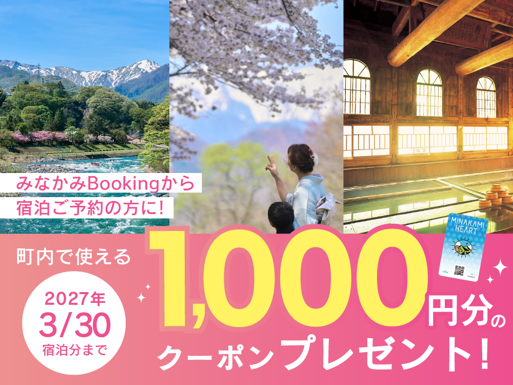 1人1泊あたり、1,000円分のMINAKAMI HEARTがチャージされたクーポンを清算時にお渡しします ※発行限度3枚=3,000円相当(1,000円相当×3連泊)/人 ※クーポンの有効期限は2027年3/31(水) ※当日の宿泊費にはご利用できません(別の会計となる精算後のお土産等の購入にはご利用いただけます。) ※MINAKAMI HEARTが使えるお店一覧はこちら