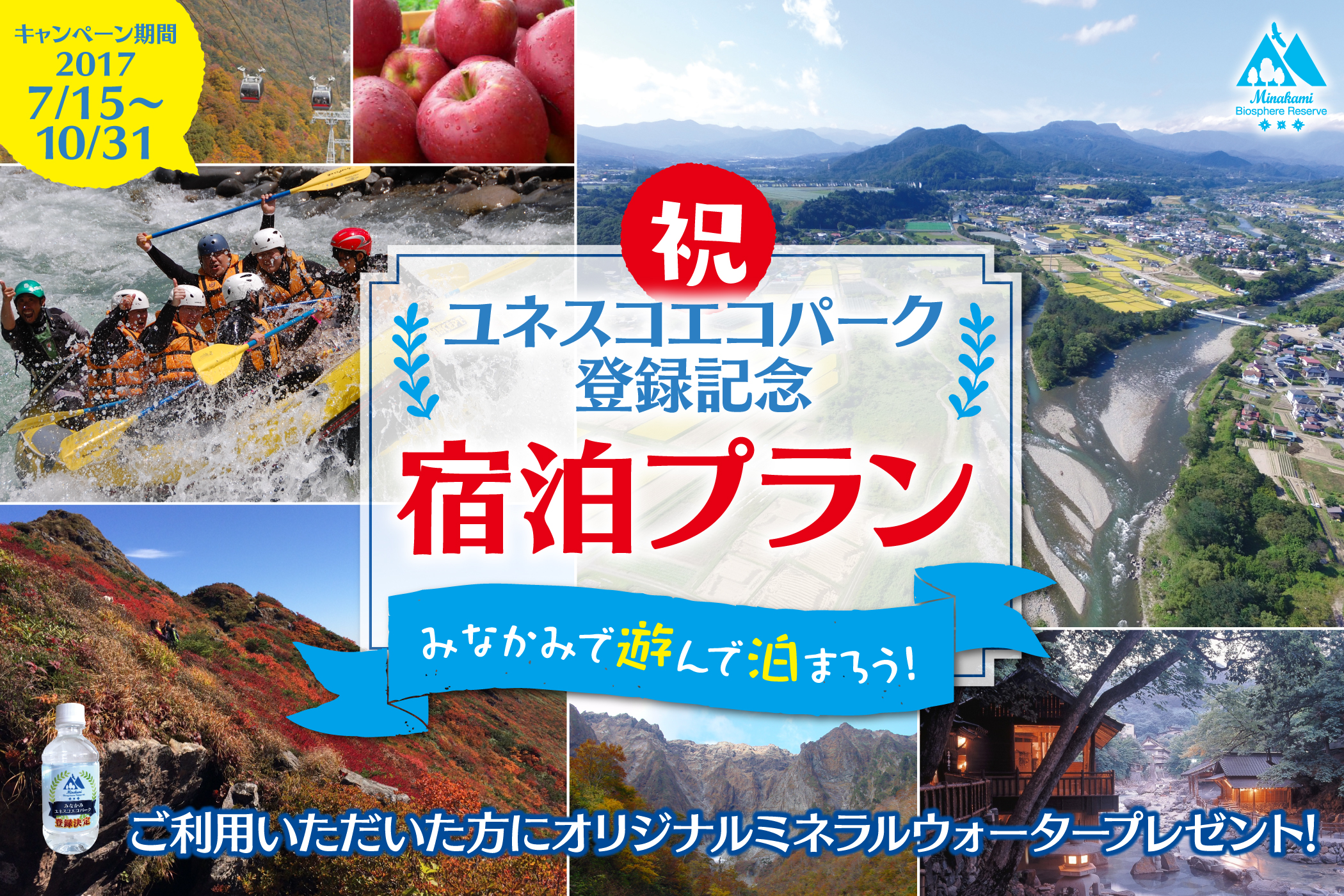 みなかみで遊んで泊まろう!2017年6月にみなかみがユネスコエコパークに登録されました!登録を記念して町内の宿泊施設でオリジナルミネラルウォーターをプレゼントするプランを販売中!ぜひご利用ください。※宿泊施設様のプラン一覧ページに該当プランがない場合は宿泊施設へ直接お問い合わせください。