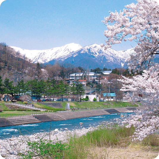 Minakami is a town of water sources surrounded by mountains. With cherry blossoms, the budding of spring, alpine flora coloring the mountains, the blazing autumn leaves, and the serene snowy landscape, the town boasts nature that can be enjoyed in all four seasons.