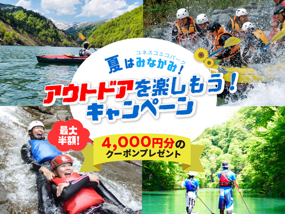 対象のアウトドア会社で8,000円以上のツアーに参加すると4,000円相当のクーポンをプレゼント! 最大半額のクーポンが付いてお得です!この夏は、群馬県みなかみ町で楽しい思い出を作ろう!